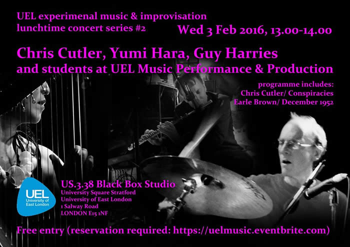3 Feb 2016, 1-2pm Chris Cutler & Yumi Hara with Students of University of East London UEL Experimental Music & Improvisation Lunchtime Concert Series US.3.38 (Black Box studio)