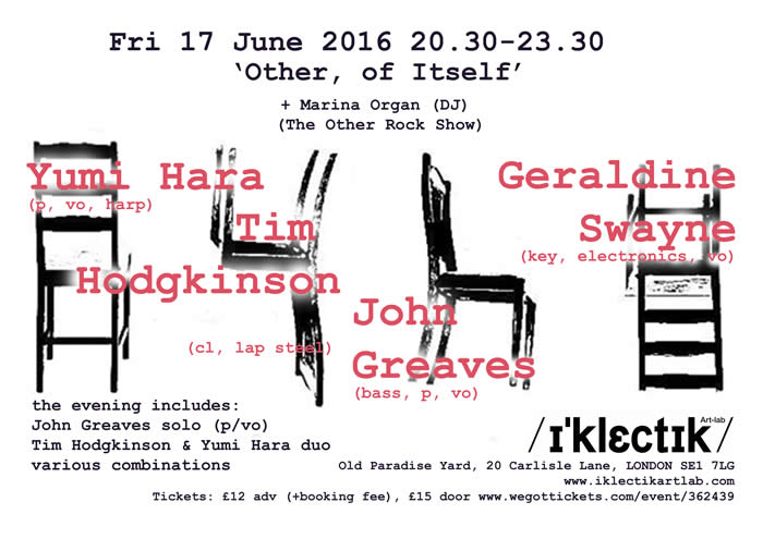 17 June 2016, 8.30-11.30 pm 'Other, of Itself' I'klectik Art-lab Old Paradise Yard’, 20 Carlisle Lane, LONDON SE1 7LG ( Royal Street corner ) next to Archbishop’s Park adv. £12 (+WeGotTickets booking fee), £15 door Tim Hodgkinson (cl, lap steel guitar) Yumi Hara (piano, harp, vo, from The Artaud Beats, Jump for Joy!, Half the Sky etc) Geraldine Swayne (key, electronics, vo, from faUSt, Jump for Joy! etc) John Greaves (bass, piano, vo, from Henry Cow, The Artaud Beats etc) the evening includes: John Greaves solo (vo/p, selection of his song repertoire) Tim Hodgkinson & Yumi Hara duo + various combinations